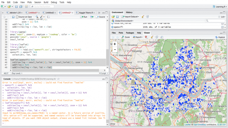‘R스튜디오’는 R를 더 쉽게 다룰 수 있게 도와주는 일종의 통합 개발 환경이다. 프로젝트 관리에도 좋고, 함수에 대해 궁금한 점이 생긴다면 바로 도움이 되는 문서를 참조할 수 있는 점도 좋다. 훨씬 편리한 인터페이스를 제공한다.