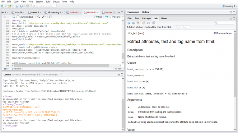 스크립트는 코드를 짤 수 있는 공간이다. 따로 텍스트 편집기를 사용할 필요가 없이 프로젝트 단위로 관리할 수 있다. 기본 R 스크립트뿐만 아니라 R 마크다운 문서를 활용해 다양한 형태의 출력물(HTML, PDF, DOC)로 변환할 수도 있다.